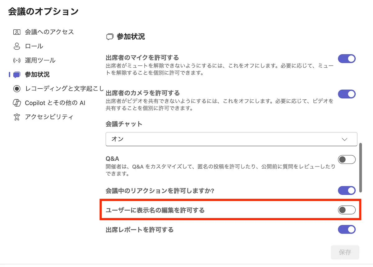 3. 「参加状況」の項目から「ユーザーが表示名を編集できるようにする」のトグルをオンにしてください.