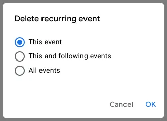 • If you also want to delete all recurring events after the event you want to delete, select “All subsequent events.”