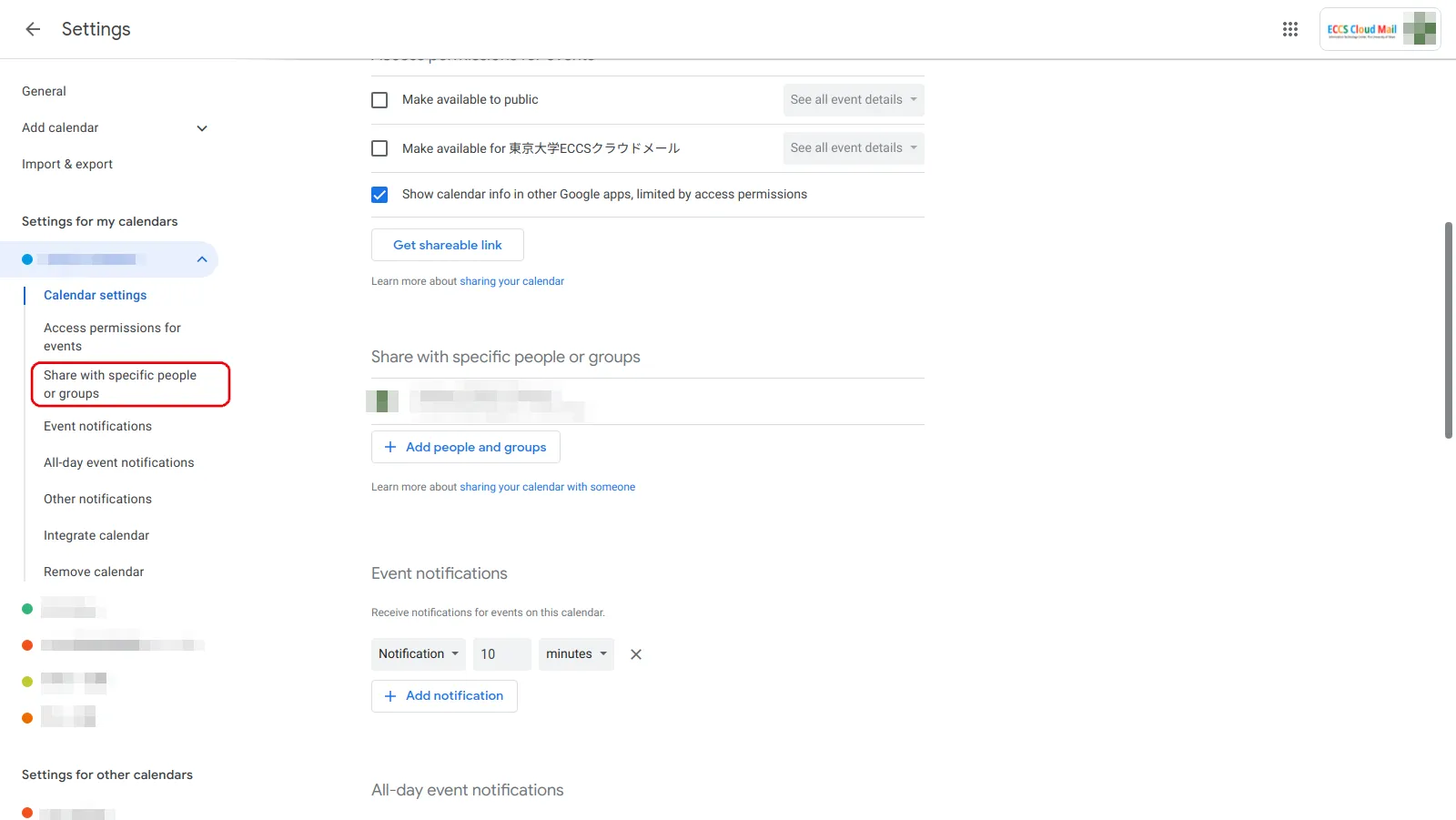 The University of Tokyo Google account (ECCS Cloud Email) is the University of Tokyo’s school account and its domain name is different from that of a general free account. You can use the calendar with a general free Gmail account, but you can access more features with ECCS Cloud Email.