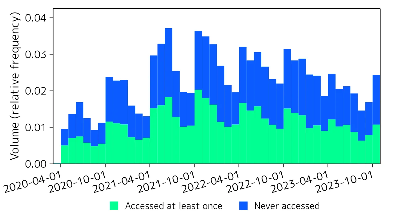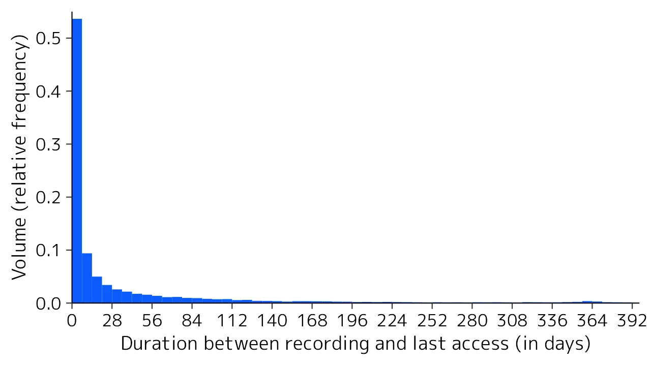 A survey of the status of stored cloud recordings revealed that approximately 50% of the volume used was data that had not been accessed even once (Figure 1 below). Of those recordings that were accessed at least once, about half were accessed within a week of recording and about 80% were accessed within two months of recording, indicating that recordings that have been accessed for a certain period of time tend not to be accessed (Figure 2 below). This suggests that a large amount of data continues to be stored even though it is no longer needed. Considering these facts, we have decided to call on our members to delete unnecessary recordings first, rather than take immediate action to impose a mandatory restriction.