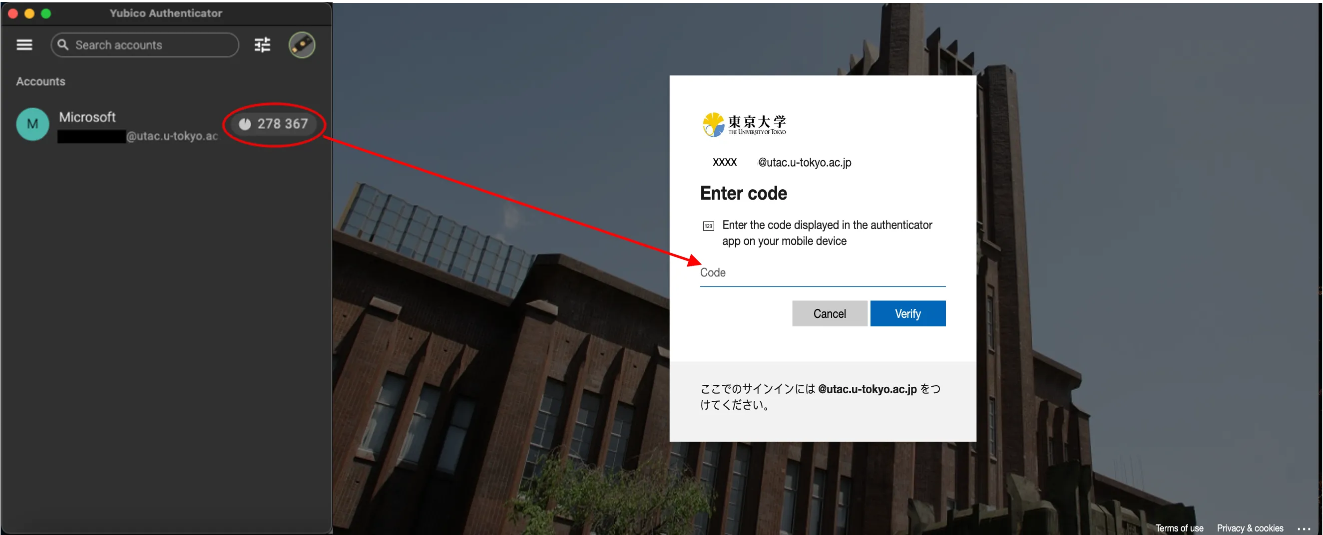 - When the “Enter code” field is displayed, please open the Yubico Authenticator application with YubiKey connected, check the 6-digit number shown in the app and enter the numbers into the input field.