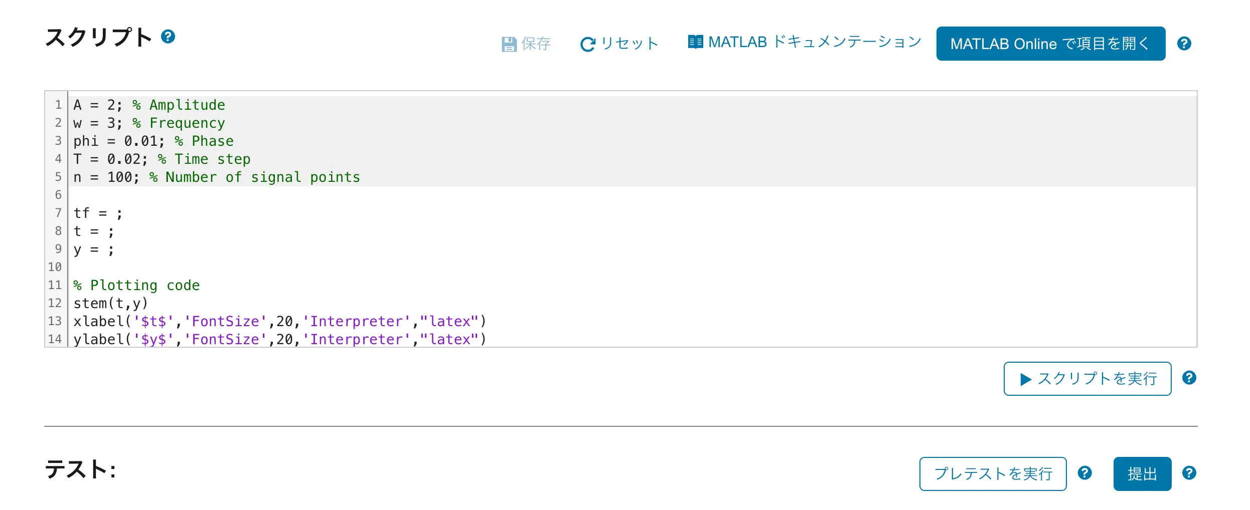 4. The following screen will appear. Follow the problem instructions to create a 「スクリプト」(Script), then click 「プレテストを実行」(Run Pretest). If no issues are found, click 「提出」(Submit).