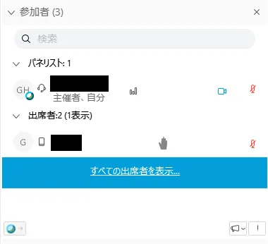 • Hand icon: Pressing the hand icon in the lower right means “raising your hand”, which will show the host that you are raising your hand. In the figure above, the person participating from the tablet is raising his hand. The list of participants who have not raised their hands can be seen by clicking “Show all attendees …”.