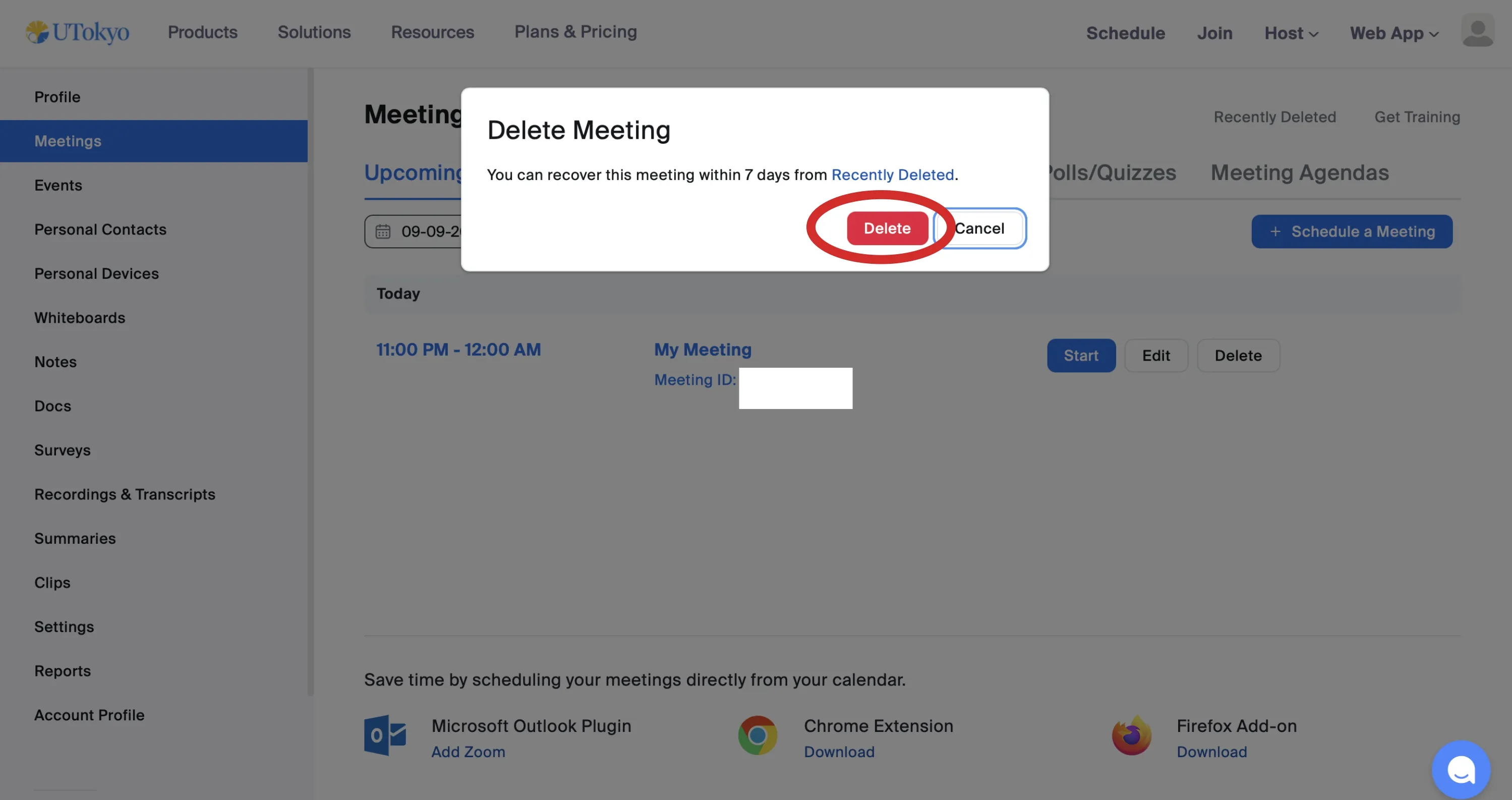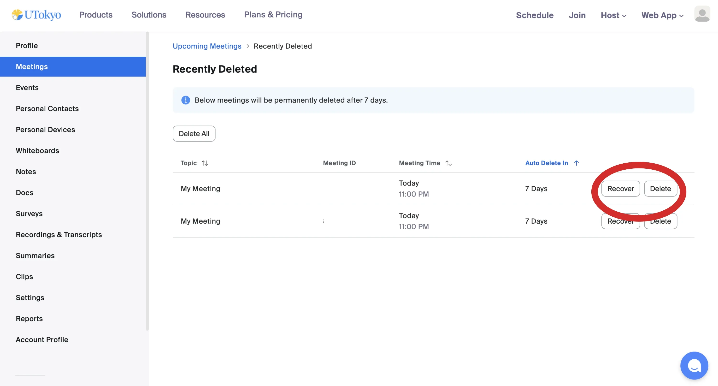 - Click Delete next to the meeting name to permanently delete the meeting without waiting for the 7-day retention period.