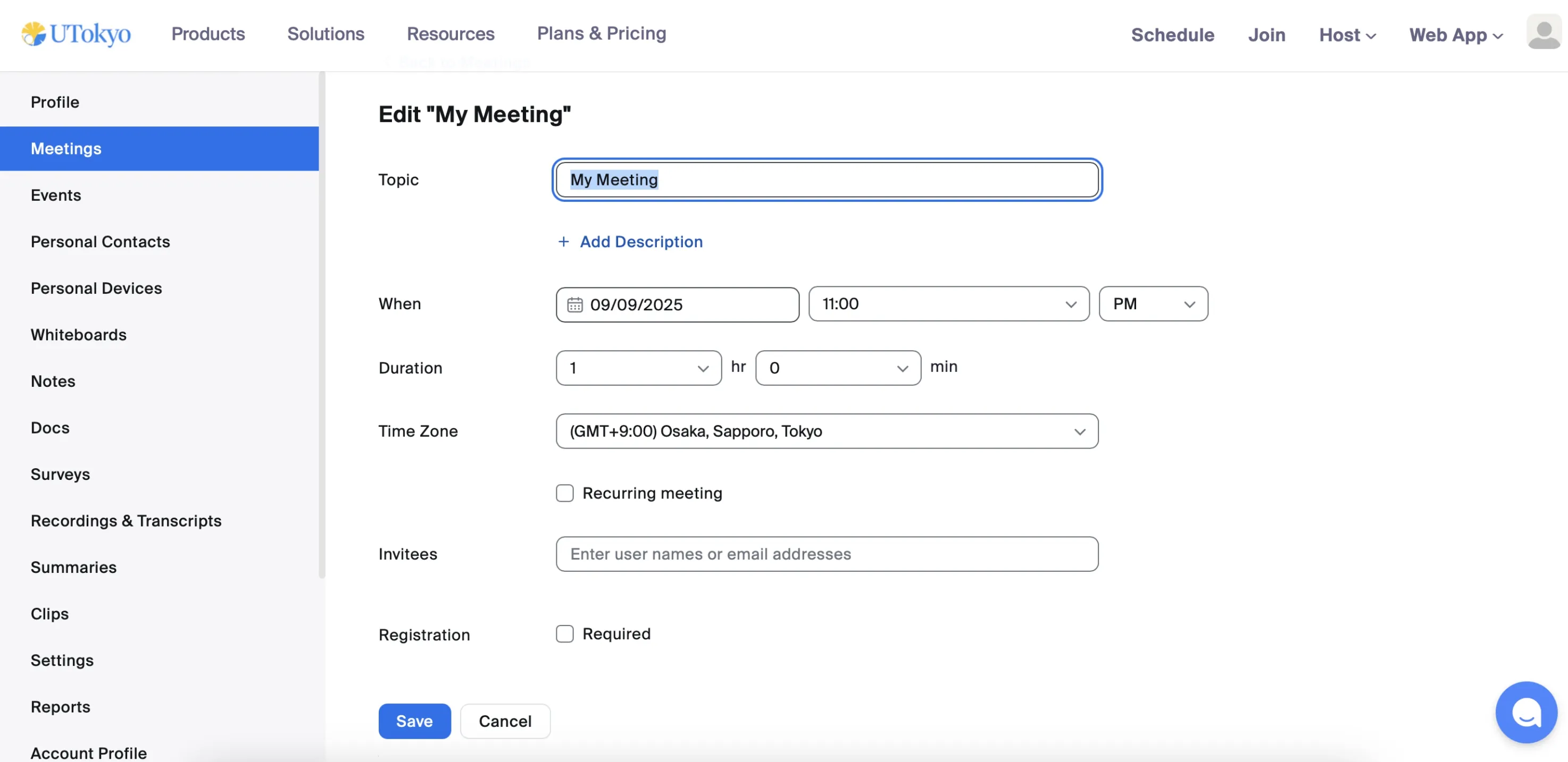 On the Meeting Edit screen, you can review and change the basic items that were set when creating the meeting, such as the meeting name (topic) and the date/time. For detailed explanations of these items, see Scheduling a Zoom Meeting.