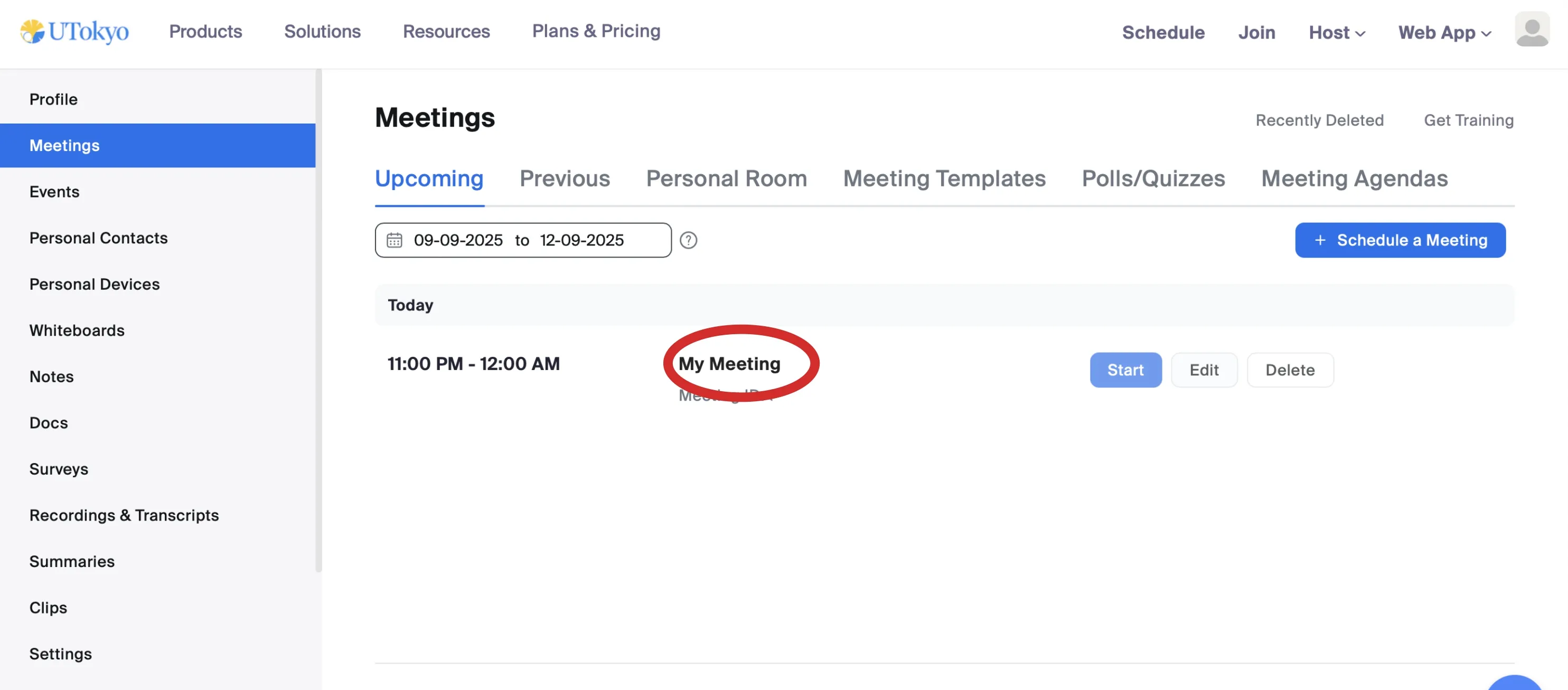 - Hover over the meeting you want to operate on, and click the Edit button that appears. This opens the Edit “My Meeting(This is where the name of the meeting you scheduled will be inserted)” screen.