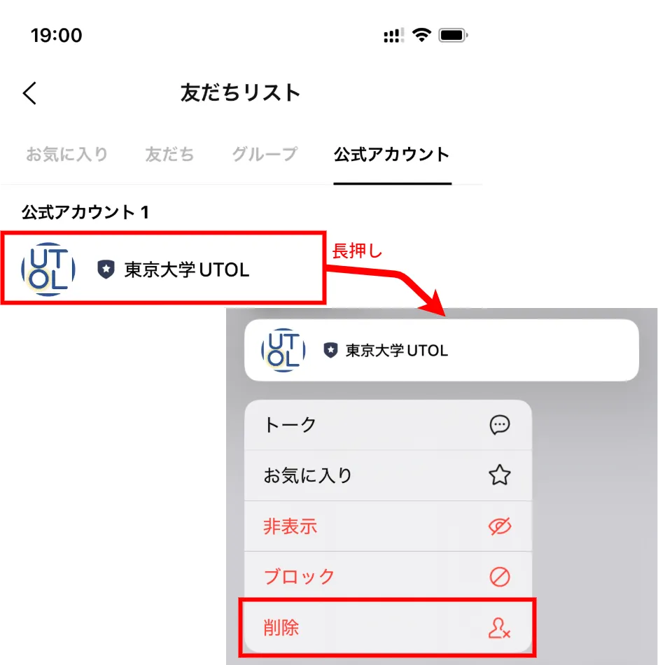 「東京大学 UTOL」をブロックするか,友だちリストから削除すると自動的に通知が解除されます.