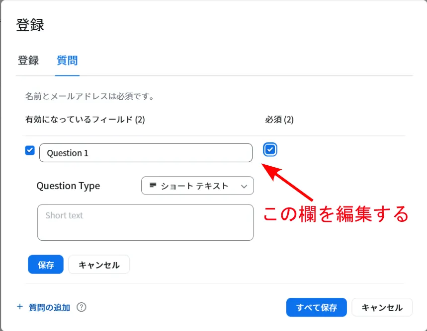 - 質問への回答を必須とするためには,右側の「必須」列のチェックボックスをオンにしてください.