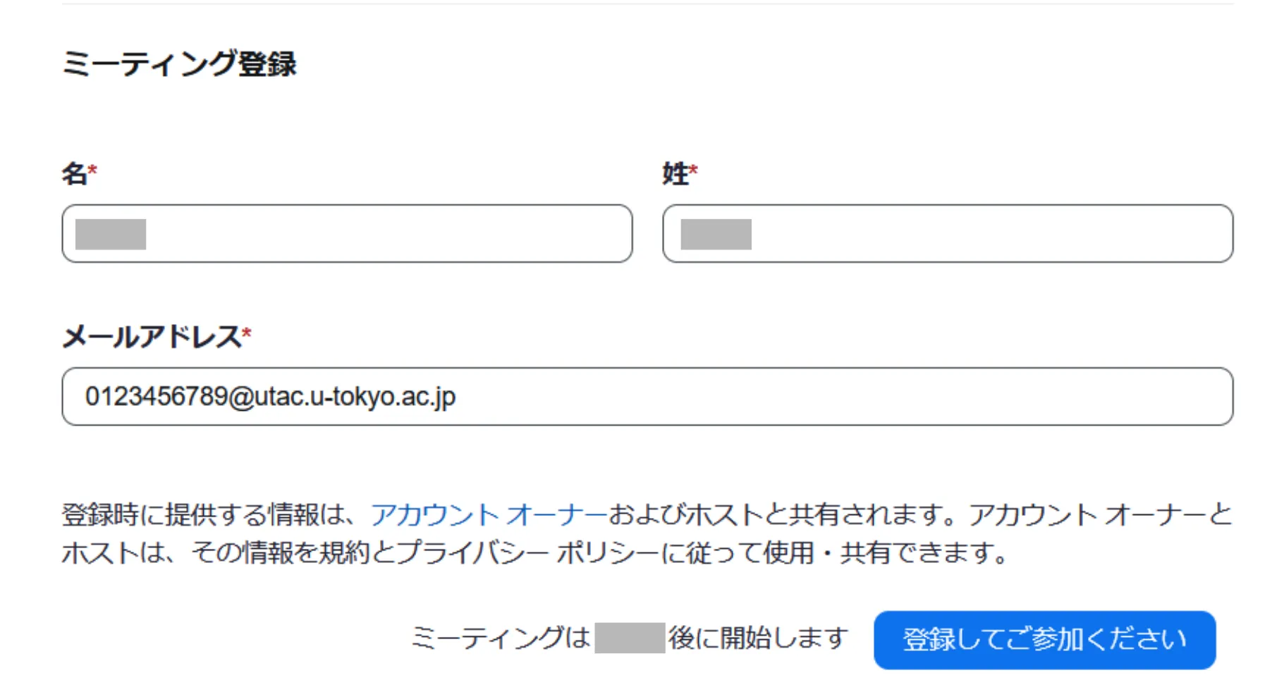 ※Zoomのシステム上は,参加希望者のメールアドレスが0123456789@utac.u-tokyo.ac.jpの形式ではなくても登録可能な場合があります(末尾がu-tokyo.ac.jpのZoomアカウントがある場合).