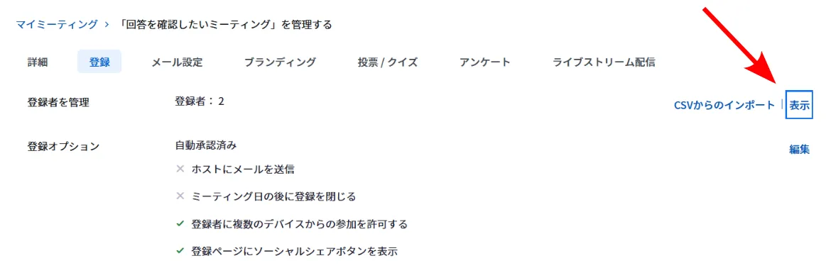 ミーティングの情報が表示されます.上の方に「登録」「メール設定」等のタブが並んでいます.「登録」タブを選択してください.