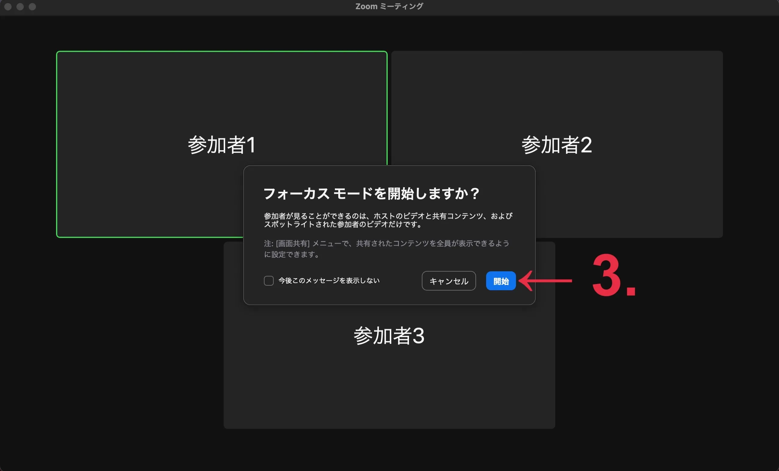 ホストのみが参加者のビデオを見える状態にする(フォーカスモード)