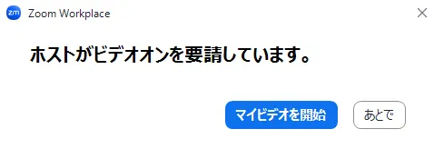 - ビデオオンを要請:参加者に対して,ビデオをオンにするように求めることができます.「参加者」タブを押し,ビデオを開始してほしい参加者の名前の上にカーソルを合わせて下さい.そして表示される三点リーダーを押し,「ビデオの要請を開始」または「ビデオの開始を要請」を選択してください.その際,求められた側には以下のような画面が表示されます.「マイビデオを開始」を押すとビデオがオンになり,「あとで」を押すことでオフのままになります.